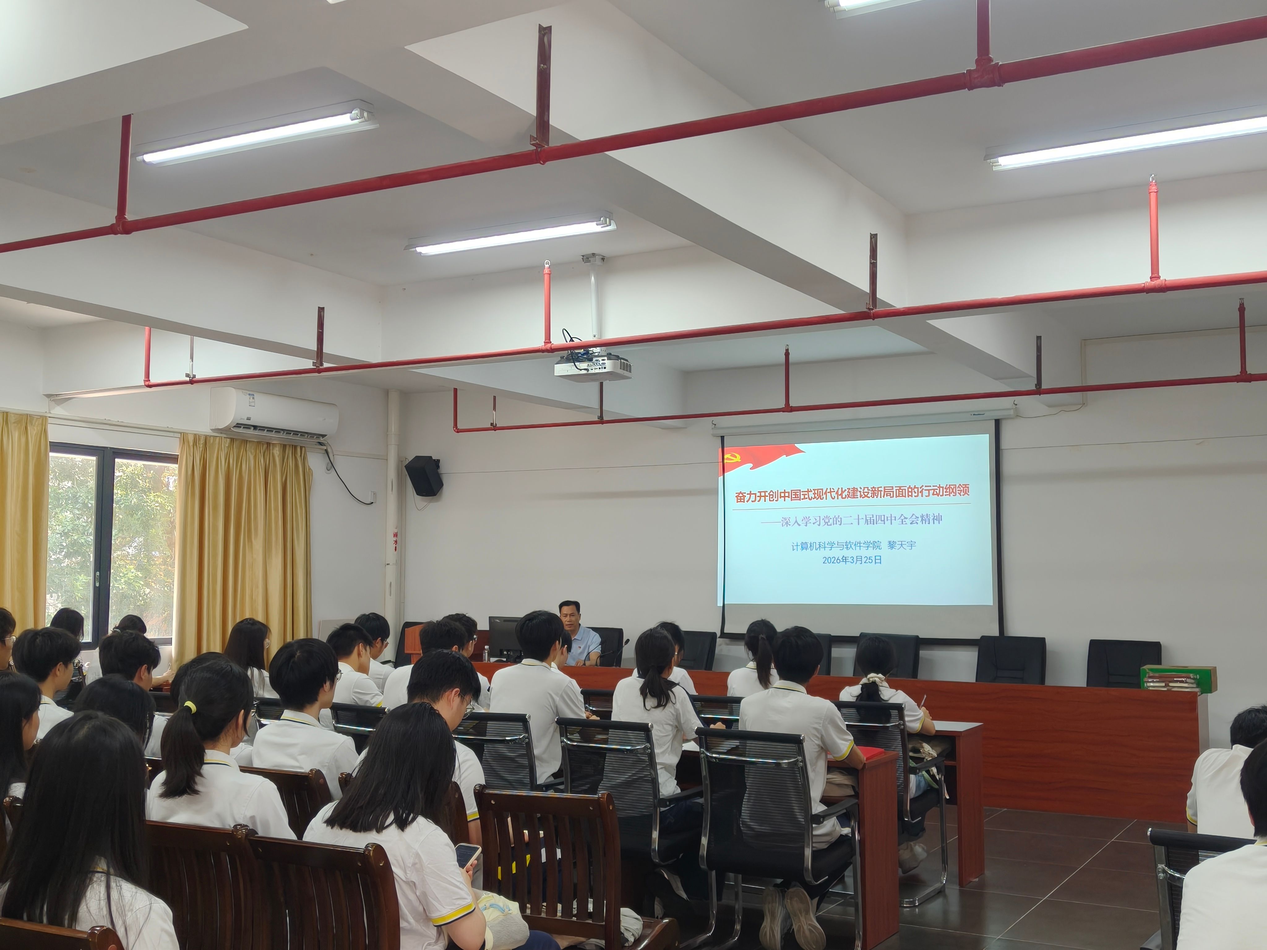 本网讯 为深入学习贯彻党的二十届四中全会精神,引导青年学子深刻领悟党的创新理论,3月25日下午,计算机科学与软件学院党委书记黎天宇在实训315会议室讲授2026年春季学期“思政第一课”,共有70名学生党员和入党积极分子代表到场聆听学习。