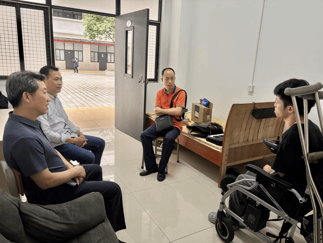 本网讯 为深入开展树立和践行正确政绩观学习教育,落实立德树人根本任务,切实关心关爱特殊学生成长成才,及时解决学生在学习生活中遇到的实际困难,传递学院的温暖与关怀,3月30日下午,学院党委书记黎天宇、主持学院行政全面工作副院长王俊波、党委副书记陈彦雄、带班辅导员吴玉丽一行,专程走访慰问25级计算机科学与技术2班“轮椅逐光者”潘志涛同学,与学生亲切交谈,倾听心声、排忧解难。