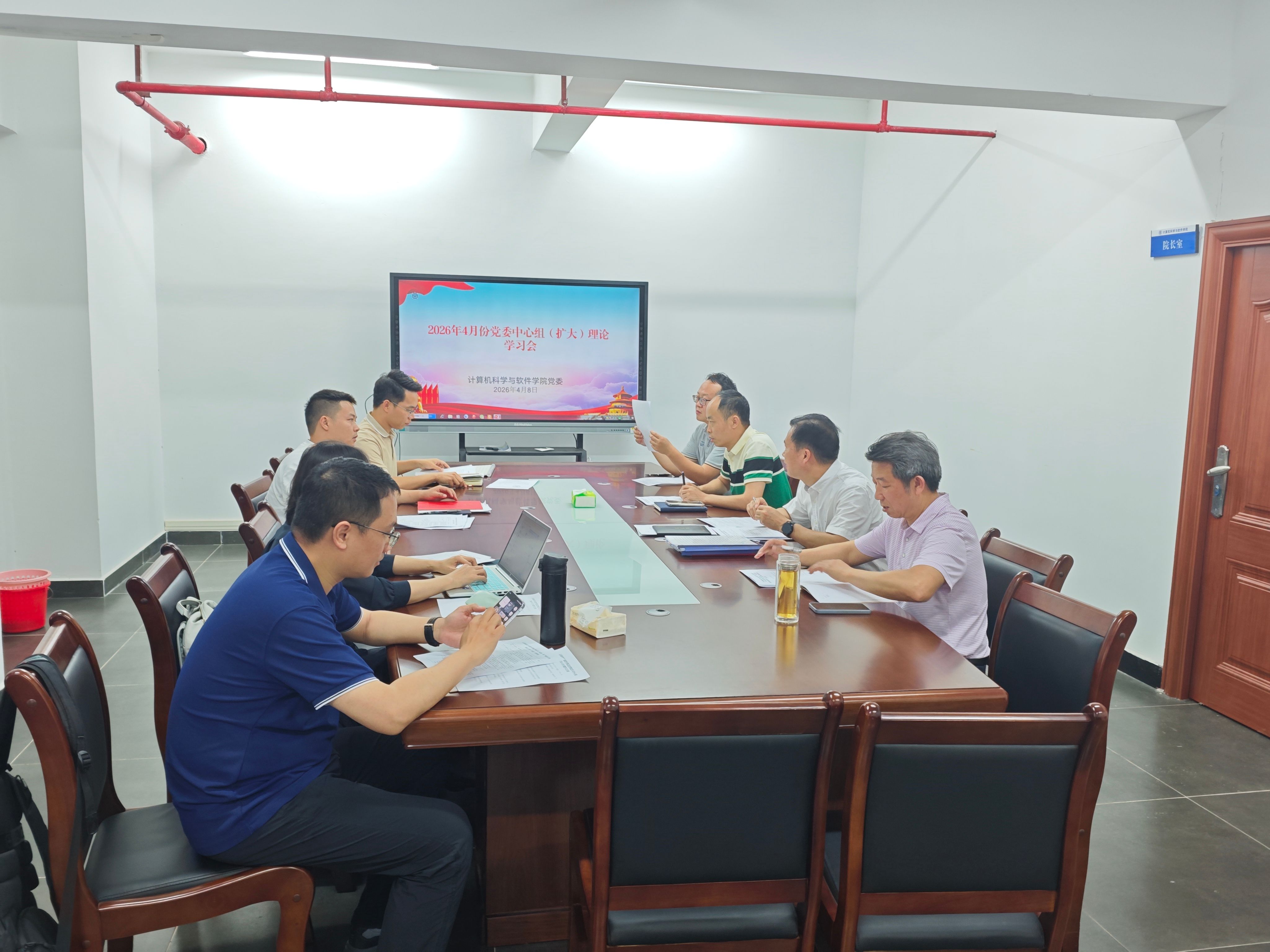 本网讯 2026年4月8日,计算机科学与软件学院党委在学院实训319会议室召开学院党委理论学习中心组(扩大)会议,学院党委书记黎天宇主持会议,学院党委领导班子、各党支部书记与专职组织员参加会议。
