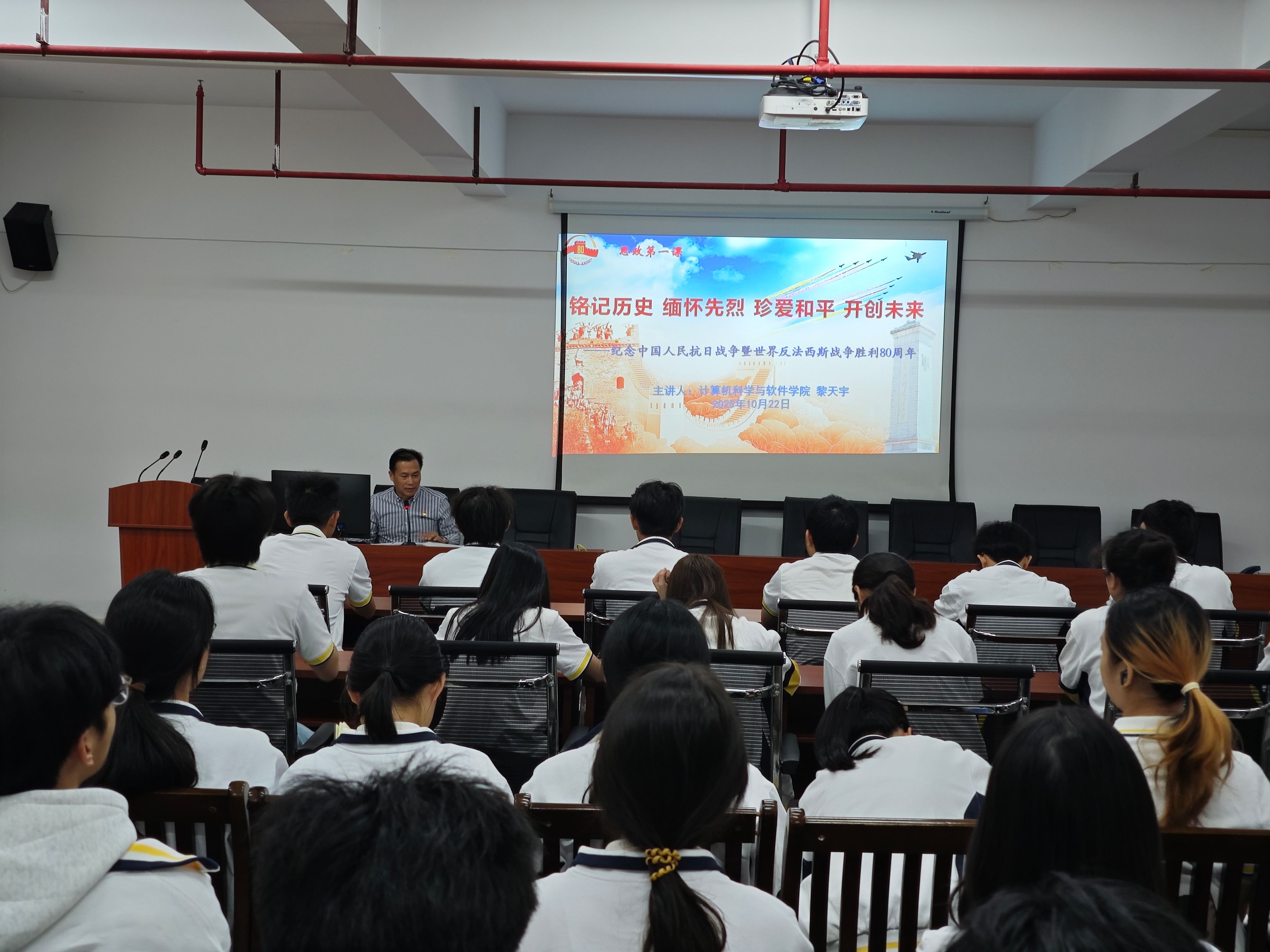 为深入学习贯彻习近平新时代中国特色社会主义思想,弘扬伟大抗战精神,激发青年学子的爱国情怀与历史责任感,10月22日,计算机科学与软件学院党委书记黎天宇于实训大楼315会议室讲授2025年秋季学期“思政第一课”,共有65名学生党员和入党积极分子代表到场聆听学习。