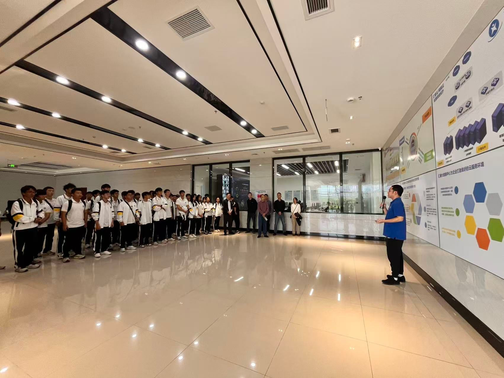 期间,同学们走进数据机房与可视化运营中心,实地参观了服务器集群和数据存储设备。针对同学们提出的“数据清洗过程中的常见问题”、“大数据安全防护的关键技术”等疑问,技术工程师结合实际案例逐一解答,并详细解读了数据管理平台在处理海量政务数据时的技术逻辑,包括如何通过分布式计算提升数据处理效率、如何利用可视化工具呈现数据洞察等,让抽象的技术知识变得具象可感。在大数据中心工作的校友、就读学院2020级软件工程专业的刘爵维分享了自己的学习经验和工作经历,勉励同学们要在学习生活中敢于实践,敢于探索。