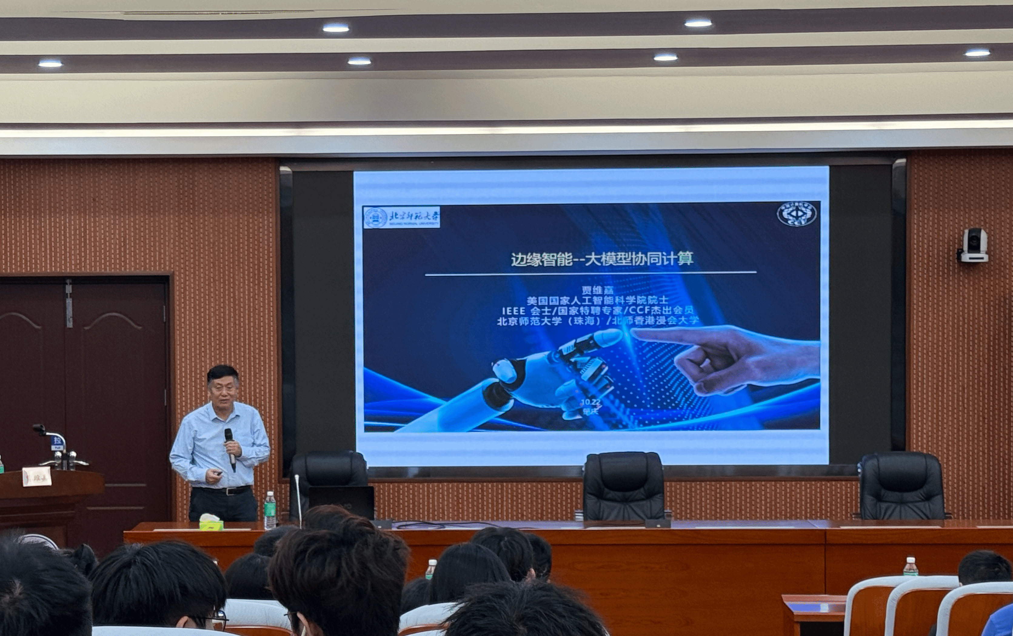 本网讯 近日,“北岭大讲堂” 第三十七讲在肇庆学院行政楼第二会议室开讲。本次讲堂特别邀请美国国家人工智能科学院院士、IEEE 会士、国家特聘专家贾维嘉担任主讲人,围绕 “边缘智能与大模型协同计算” 展开深度分享,众多师生齐聚现场,认真聆听演讲,共同探索智能计算领域前沿方向。
